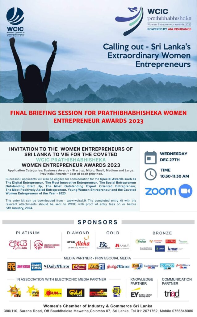 The final briefing session for applicants of the WCIC ‘Prathibhabhisheka’ Women Entrepreneur Awards 2023 will be on 27th December at 10.30am Sri Lanka time. We encourage all aspiring women entrepreneurs in Sri Lanka and the SAARC Region to apply. This *online briefing session* will guide you on the ins and outs of the application and its evaluation process.